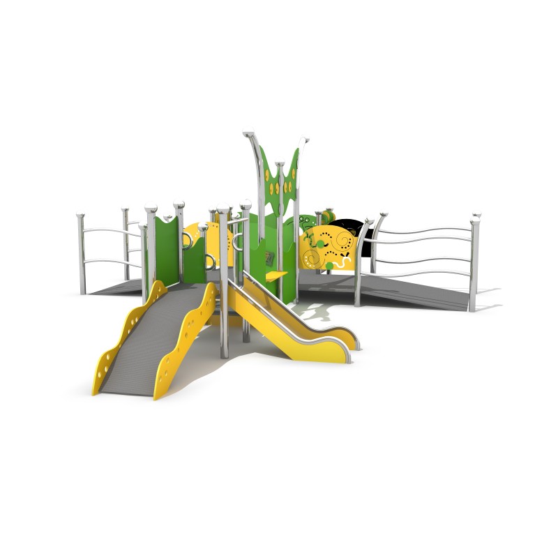 Višenamjenski set za korisnike invalidskih kolica s glazbenim pločama. Konstrukcija od nehrđajućeg čelika. Glazbeni panoi u žutoj i zelenoj boji.