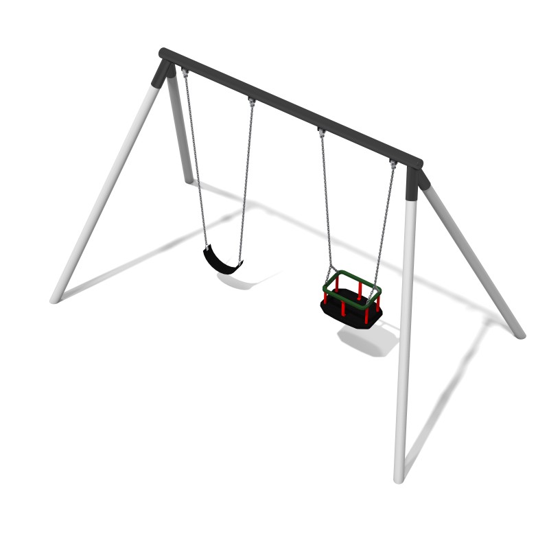 Dvostruka ljuljačka s fleksibilnim sjedalom i baby box sjedalom namijenjena za bebu i 1 osobu. Boja konstrukcije je siva i grafit, boja sjedala je crna.