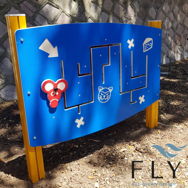Ploča za igru Labirint. Potporni stup od vrhunske kvalitete nordijskog bora s finim i kompaktnim vlaknima; sa zaobljenim kutovima i zaobljenim rubovima s nedeformabilnom trolamelarnom obradom i profilom djeteline protiv pucanja, opremljen polietilenskim poklopcem u boji. Impregniran u autoklavu s netoksičnim solima protiv truljenja i podvrgnut tretmanu protiv razgradnje i UV zaštitnom obradom s posebnim završnim premazom na bazi vode za ručno nanošenje. Oblikovana dvobojna polietilenska ploča s ukrasnim gravurama, dostupna u raznim anti-UV bojama. Ovisno o modelu, tu su: polikarbonatni umeci, čelične cijevi i ploče presvučene prahom, cijevi od nehrđajućeg čelika, plastične kugle, rotacijski polietilenski valjci s ukrasnim naljepnicama.
