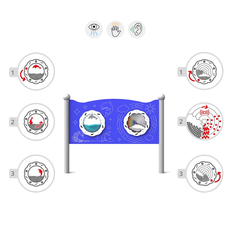 Dvostruka senzorna ploča za kreativnu igru sa zvukom koji pojačava kreativnost i osjetilno iskustvo djece, uključujući i onu u invalidskim kolicima. Oprema ima dvije ploče: jednu s brzo rotirajućim kotačićem s plastičnim loptama od 100 duginih i oblaka u boji UV stabilnim i drugu s rotirajućim bubnjem s ronjenjem i skakanjem dupina koji se sastoji od 100 plastičnih loptica. Struktura ploče je crni čelik premazan prahom, otporan na vremenske uvjete i spreman za intenzivnu upotrebu. Ploča je izrađena od HDPE plastike. Stupovi su završeni kuglastim ukrasnim elementima.